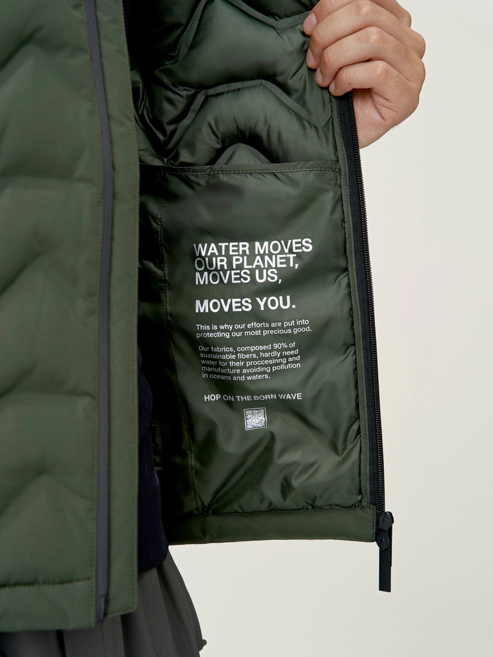 Vest made from “Hydre_T” fabric, water-repellent (waterproof 1000mm) and wind-repellent (windstopper), with a matte finish. Padded bands heat-sealed with “heat seal” technology. Side pockets with hidden zip. Comfortable collar. Rounded back for better coverage. Vegan filling. • Sustainable fibres• TPU Membrane• Waterproof 1000 mm• Windstopper• Extra soft touch• Warm fabric• Vegan Our commitment We produce our garments from sustainable fibres that barely require any water, both in their production and during their subsequent life cycle. We use quality fabrics that do not require chemical treatments, reducing water consumption and avoiding the release of micro-plastics during washing. Composition and care 100% Polyamide Size and cut The model is wearing a size M and their measurements are: • Height: 1.85 m • Chest: 97 cm • Waist: 80 cm • Hips: 90 cm