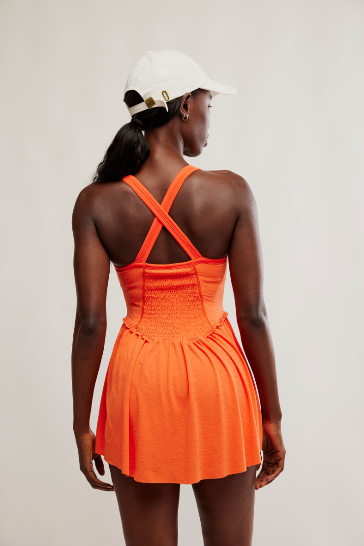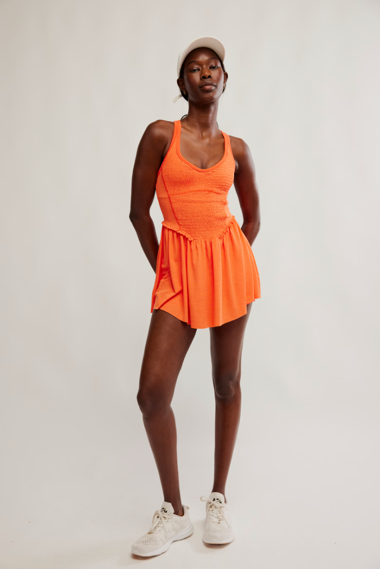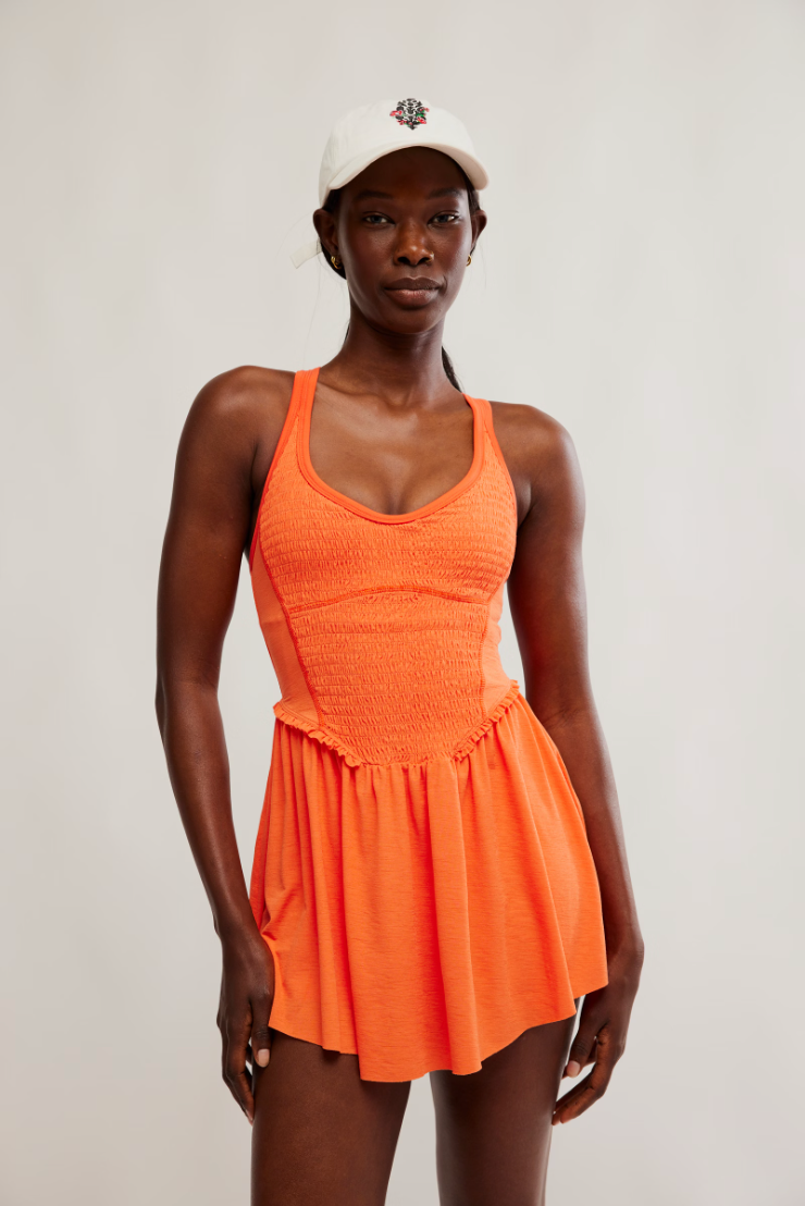 Features: Lightweight, soft fabrication is sweat-wicking; built-in shorty bodysuit (bra and shorts) for added coverage; smocked front with elasticated ruching; sweetheart-neck; cross-back strap detail; built-in shorts feature phone pocket; corset-style detailing